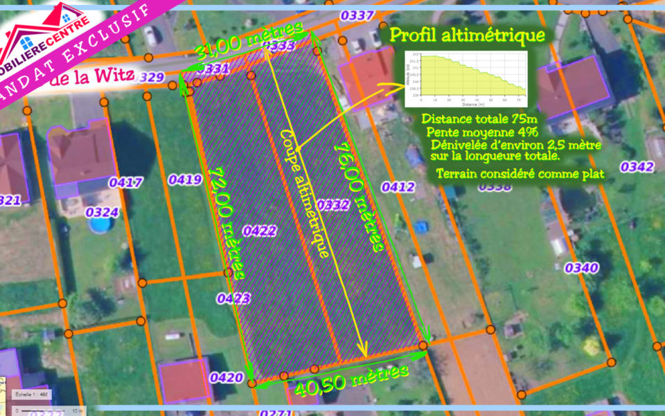Le terrain est plat avec une très faible dénivelée d’environ 2,50 mètre, sur les 70 mètres de long. Autant dire que c’est le terrain rêvé pour faire une maison de plain-pied non mitoyenne.